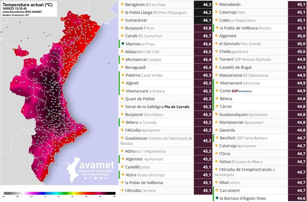 Los valores récord absolutos pasadas las 15 horas tarde los tenían Benigànim, con 46,3 grados, la Pobla Llarga, con 46,2 y Sumacàrcer con 46,1