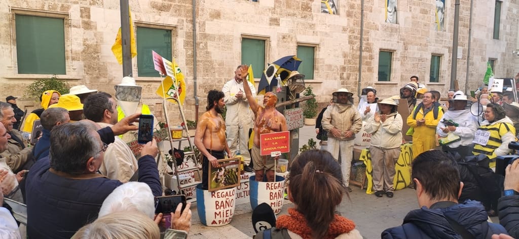 Algunos dirigentes se han bañado en miel ante los medios de comunicación para denunciar la crisis de precios de ese producto como consecuencia de las masivas importaciones procedentes de terceros países. Al concluir el acto las organizaciones agrarias han hecho lectura del manifiesto con las reivindicaciones y seguidamente lo han presentado por registro de entrada dirigido a los diferentes grupos parlamentarios y a Les Corts.
