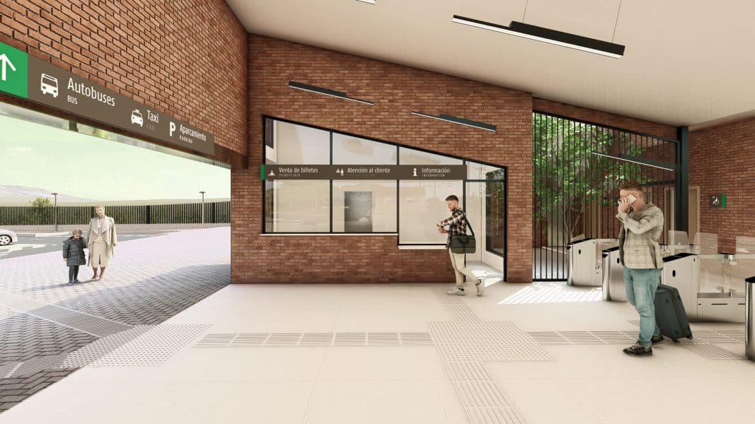 Edificio de viajeros. El nuevo edificio se ubicará en el margen sur de las vías, sobre el actual aparcamiento, y contará con una única planta sobre rasante y un paso inferior bajo vías. Se ha diseñado con criterios de eficiencia energética, arquitectura integrada en el paisaje urbano y perspectiva de género. En sus 447 m2 de superficie se desplegarán el vestíbulo y el control de accesos; la zona de venta de billetes y aseos accesibles; y espacios técnicos de uso interno. Por otro lado, se creará un nuevo acceso norte desde la plaza de Mariano Benlliure, mediante la construcción de un acceso cubierto pero abierto, con paramentos de ladrillo visto y celosías que combinan tradición y modernidad. Este volumen más ligero incluirá un pequeño vestíbulo y acceso directo al paso inferior.