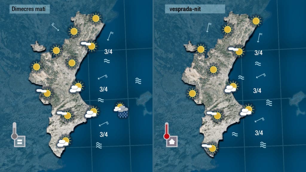 Mañana miércoles todavía se registrará algún chubasco entre el sur de las Baleares y la Comunitat Valenciana, pero difícilmente tocarán tierra. La nubosidad será más abundante en el sur pero no será obstáculo para que las temperaturas suben ligeramente.