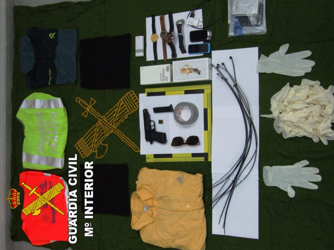 Es van realitzar dues entrades i registre en els domicilis habituals de l’autor identificat, confiscant-li en una bossa d’esport l’arma curta i la camisa del servei postal amb la qual es va perpetrar l’assalt a l’habitatge, a més d’un jupetí reflector oficial de la Guàrdia Civil de Tràfic, una samarreta bicolor oficial de la Guàrdia Civil, brides, cinta americana, dues bufandes tubulars de color negre i altres materials d’ocultació, recuperant 5 rellotges, 5 telèfons mòbils.