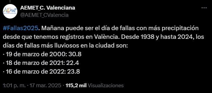 Añadía que «desde 1938 y hasta 2024, los días de fallas más lluviosos en la ciudad fueron».