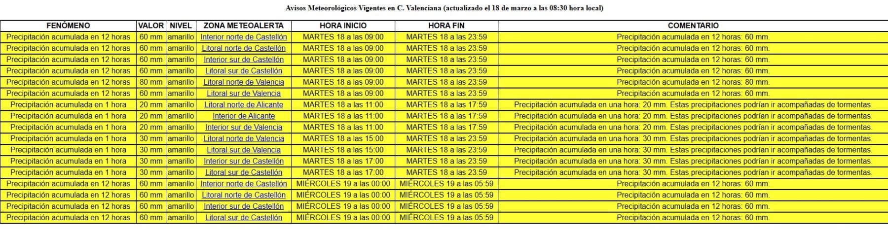 Los avisos por lluvia en toda la Comunitat Valenciana según la última actualización de esta mañana, a las 8:12, mantienen el nivel máximo amarillo por lluvias. Y el detalle por zonas confirma también que las precipitaciones se mantendrán durante todo el día, en las tres provincias.