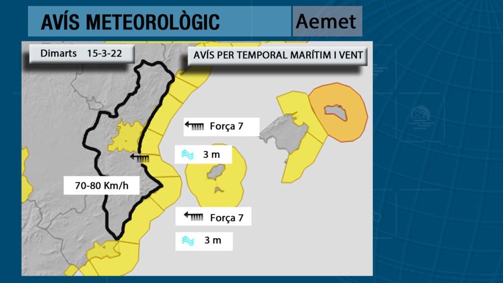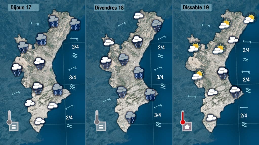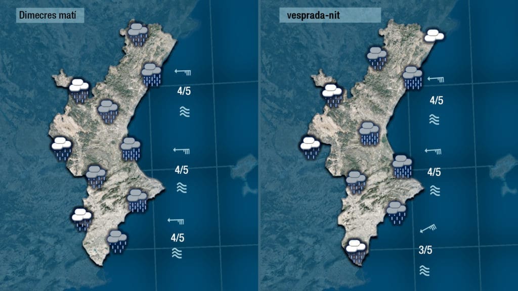 Jueves también estaremos a ‘remojo’ con lluvias más abundantes, generales e intensas a la costa que en el interior y con vientos de levante y gregal que soplando moderados llevarán las precipitaciones hace falta sur de cara por la tarde.