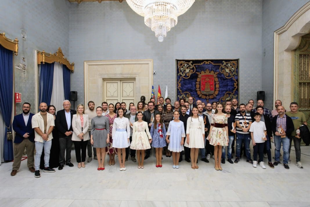 La Corporación Municipal ha recibido antes a las Belleas del Foc 2022 -Marina Niceto Valera y Valeria Gómez Villaescusa- y a sus Damas de Honor adultas e infantiles en el Salón Azul.