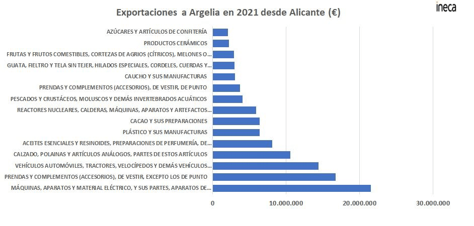 Alicante con Argelia no tiene mucho peso en la facturación comercial internacional total, ya que de los 6.216,1 millones de euros que se exportaron en 2021, tan sólo 135,7 millones proceden de la balanza comercial con Argelia, un 2,1%. No obstante, Llopis ha indicado que debemos estar pendientes también de cómo afecta a otras provincias, cuyos productos consumimos. De igual modo, puede afectar a empresas alicantinas que tienen delegaciones en este país mediterráneo.