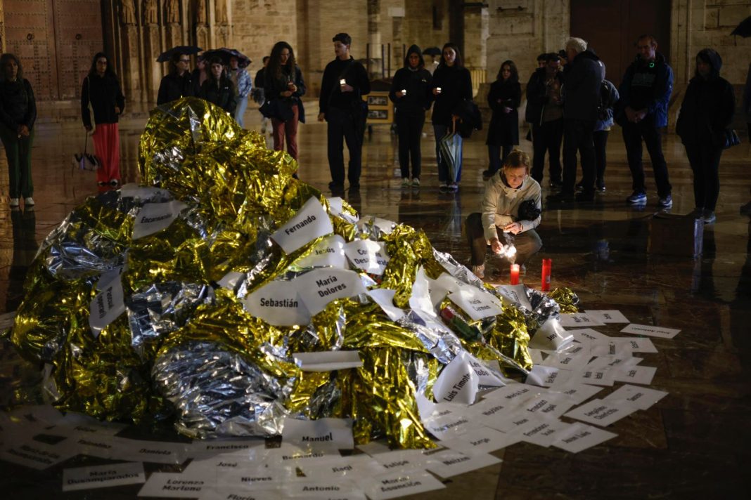 En la plaza de la Virgen había un montículo de mantas térmicas usadas en la protesta del día del funeral. Poco después de las diez de la noche, una ráfaga de aire acercó una de las mantas a un cirio. La llama prendió de inmediato. En apenas un par de minutos, toda la montaña ardió y se redujo a cenizas. La Policía Local llegó con un extintor para sofocar el fuego.