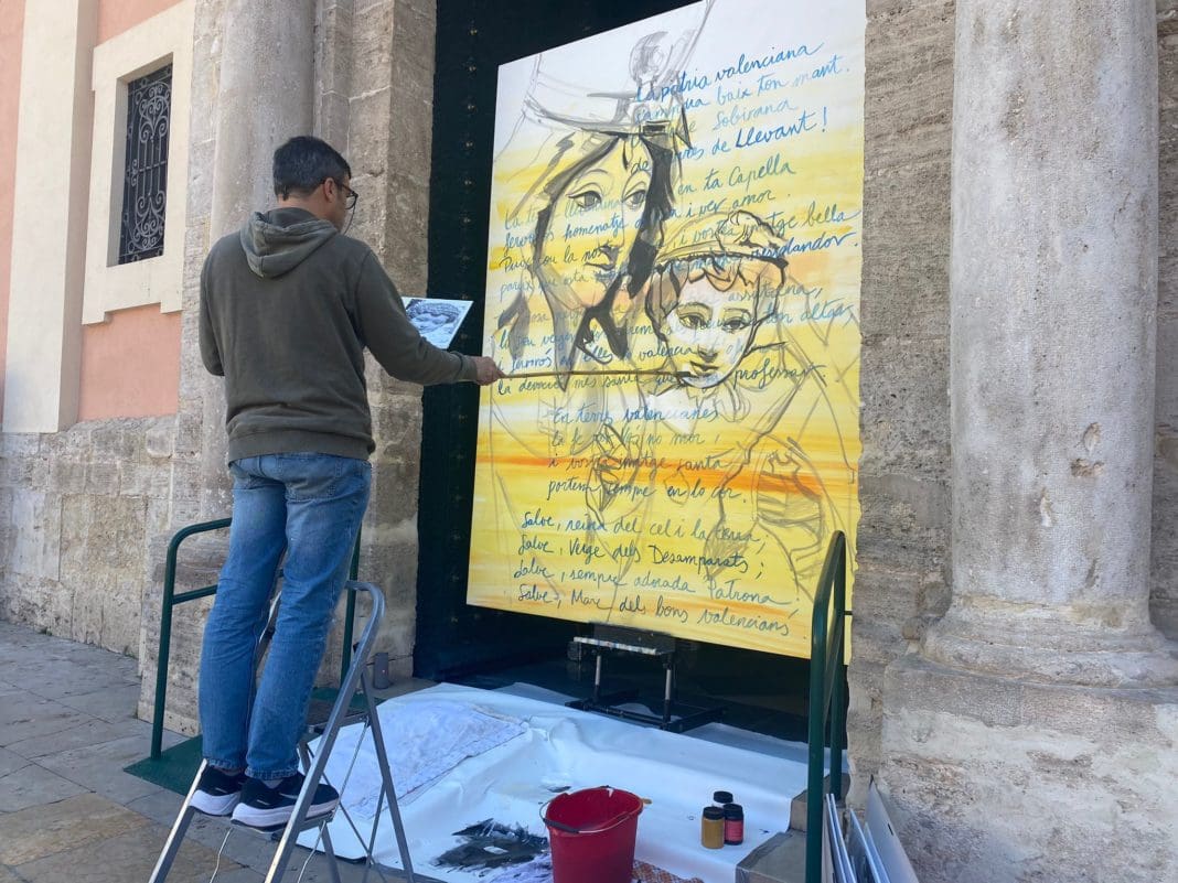 El artista valenciano Luis Lonjedo ha pintado este miércoles durante doce horas un cuadro gigante en honor a la Mare de Déu en la puerta de la Basílica. Asimismo, tal y como ha detallado el artista la principal novedad es que “pinto la imagen de la Virgen y el Niño Jesús sobre un lienzo donde está escrito a mano el Himno de la Coronación, así le da un toque de autenticidad y es más personal». Trabajar con esta base hace que, «poco a poco, el dibujo va tomando protagonismo sobre la letra y empieza a surgir la imagen, aunque quedan palabras sueltas”, alega.