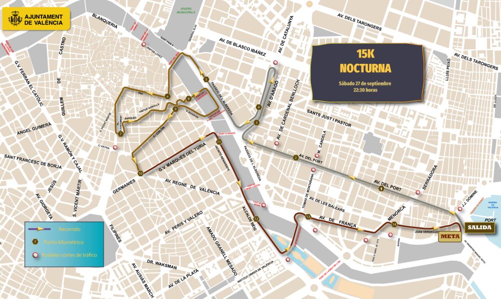 El circuito de esta carrera nocturna es completamente llano, está homologado por la Real Federación Española de Atletismo y permite disfrutar de lugares “icónicos” de la ciudad como el Estadio de Mestalla, el Puente del Real, la calle de la Paz, la plaza de la Reina, la del Ayuntamiento o la Ciudad de las Artes y las Ciencias, entre otros.