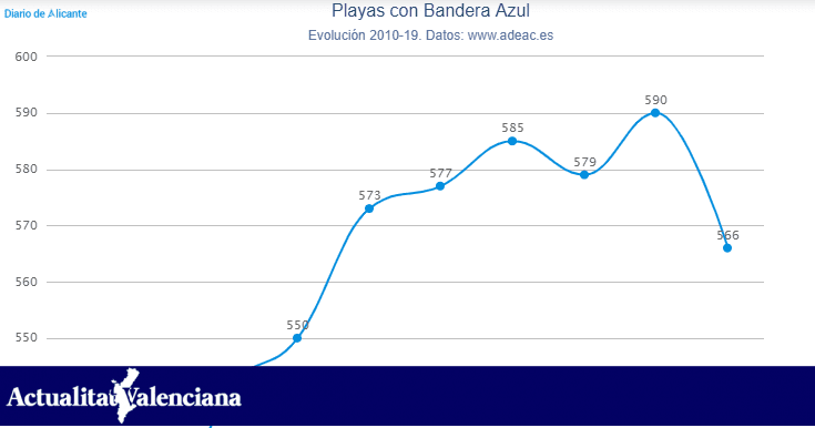 L’Associació d’Educació Ambiental i del Consumidor (Adeac), promotora de la iniciativa, ha difós aquest dimarts la llista de banderes blaves per a 2019, que sumen un total de 669 (566 platges, 98 ports i 5 embarcacions sostenibles). D’aquesta manera, Espanya ha perdut 25 banderes blaves a les seues platges fins a aconseguir un total de 566 insígnies, la qual cosa significa un 4% menys respecte a les 590 de l’any passat, encara que continua liderant sense interrupció el rànquing mundial des de 1987.