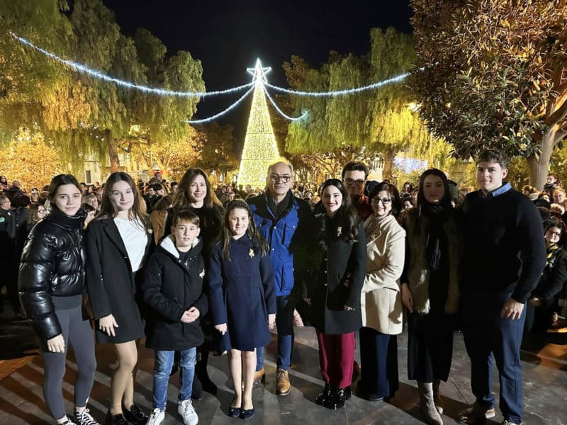 Por su parte las falleras mayores y los festeros mayores de 2024 junto con el alcalde y la concejal de fiestas fueron los encargados de pulsar el botón del árbol de 10 metros y 8.100 leds instalado en la Avenida de Montiel.