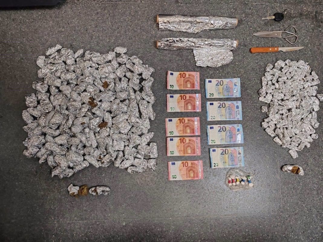 En total se encontraron 181 dosis de marihuana, con un peso de unos 150 gramos, 6 gramos de cocaína en envoltorios de un gramo, papel de aluminio, tijeras, un cuchillo y 130 euros fraccionados en billetes pequeños.