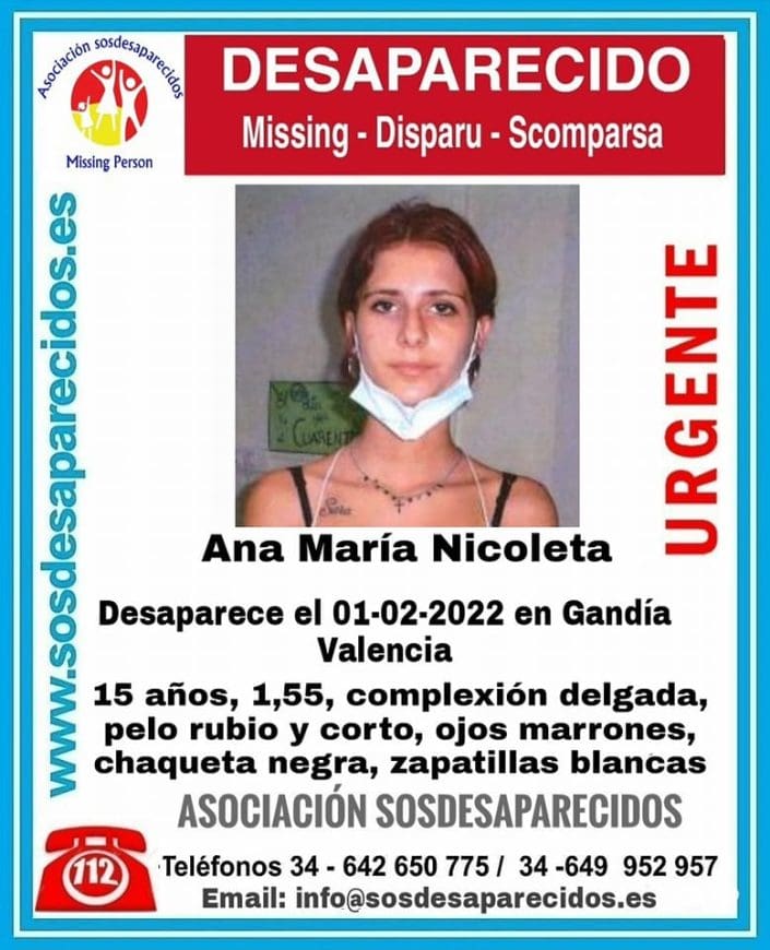 La plataforma SOS Desaparecidos ha activado una alerta para encontrar a la menor Ana María Nicoleta de 15 años desaparecida en Gandía.