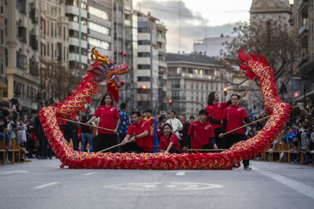 El centro de la ciudad de València se ha llenado este sábado de colores rojos y dorados, dragones, espadas, farolillos de papel, sombrillas y uniformes de artes marciales con motivo de la Cabalgata que celebra el Año Nuevo Chino, concretamente el año 4723, que entrará en el calendario el miércoles 29 y está dedicado a «la Serpiente».