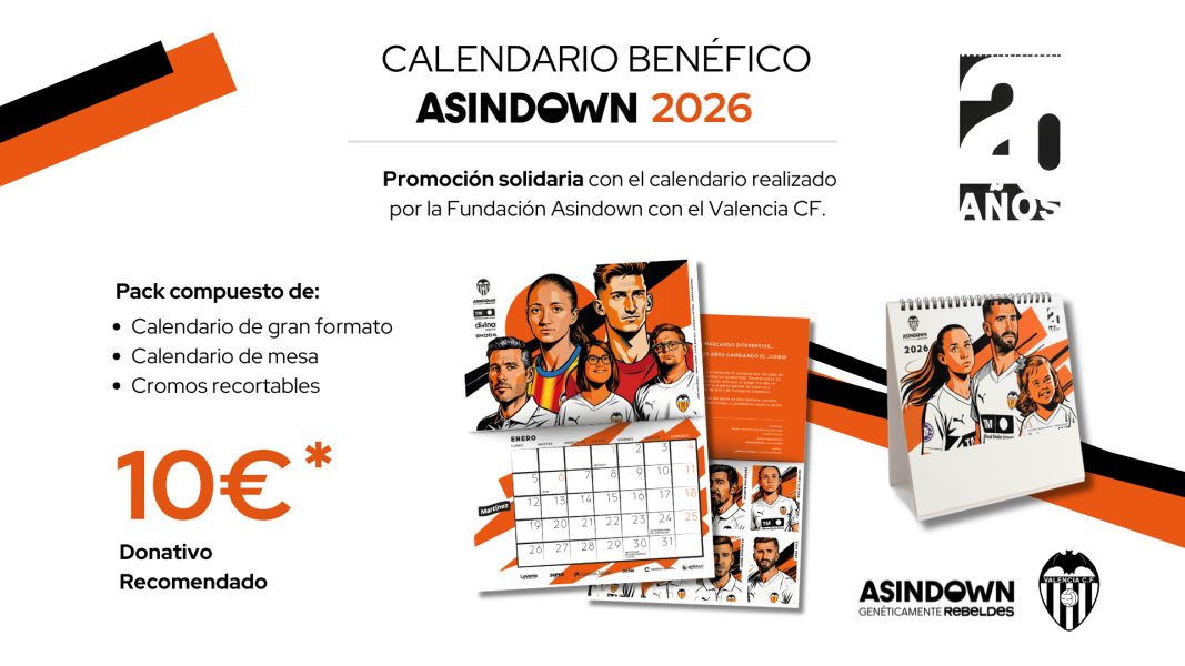 Valencia CF y la Fundación Asindown han presentado el calendario benéfico de su 20º aniversario, con jugadores de las primeras plantillas y leyendas del club. El pack 'Genéticamente Rebeldes 2026' incluye gran formato, cromos conmemorativos y calendario de mesa por un donativo recomendado de 10 euros.