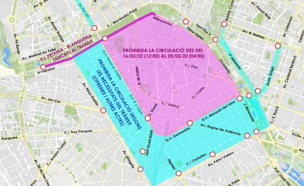 El perímetro interior afectado comprende la marginal derecha del antiguo cauce del río Túria, el puente de las Glorias Valencianas hasta la plaza de América y las Grandes Vías, incluida la plaza de España y el paso inferior del paseo de la Petxina. Asimismo, estos trazados podrán verse ampliados a las calles colindantes y hasta la segunda ronda de circunvalación en necesidad del resto de actos como la Ofrenda, reparto de premios o pasacalles falleros.