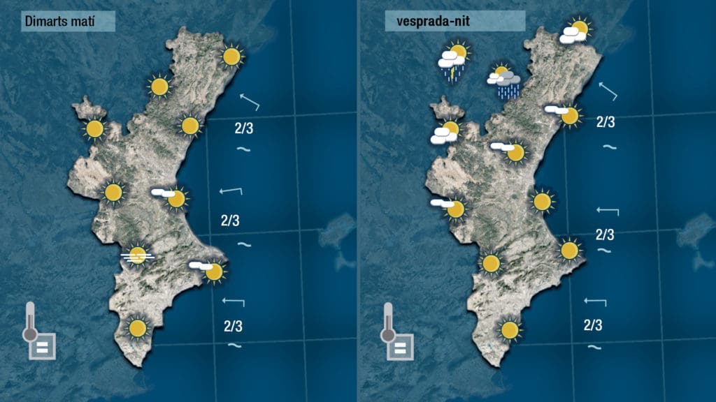 Pocos cambios espero para mañana martes. Continuará haciendo mucho calor y a pesar de que se verán nubes por la tarde en las montañas del norte no creo que llegan a afectar la Comunitat Valenciana.