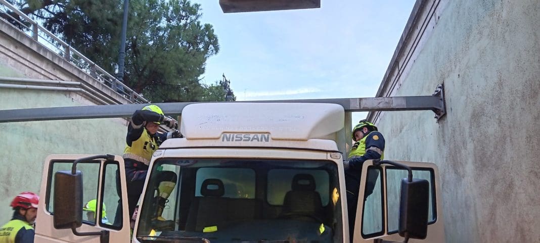 Los Bomberos de València han acudido al aviso de la Policía Local porque un camión había quedado enganchado en el túnel de C/ Guillem de Castro dirección C/ A. Guimerá.