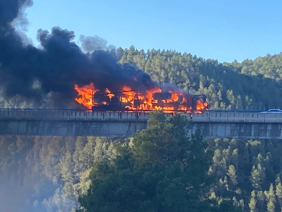 El incendio de un camión que circulaba por la A-3, a la altura del viaducto de Buñol, ha obligado a cerrar totalmente al tráfico de la autovía en sentido Madrid durante varias horas.