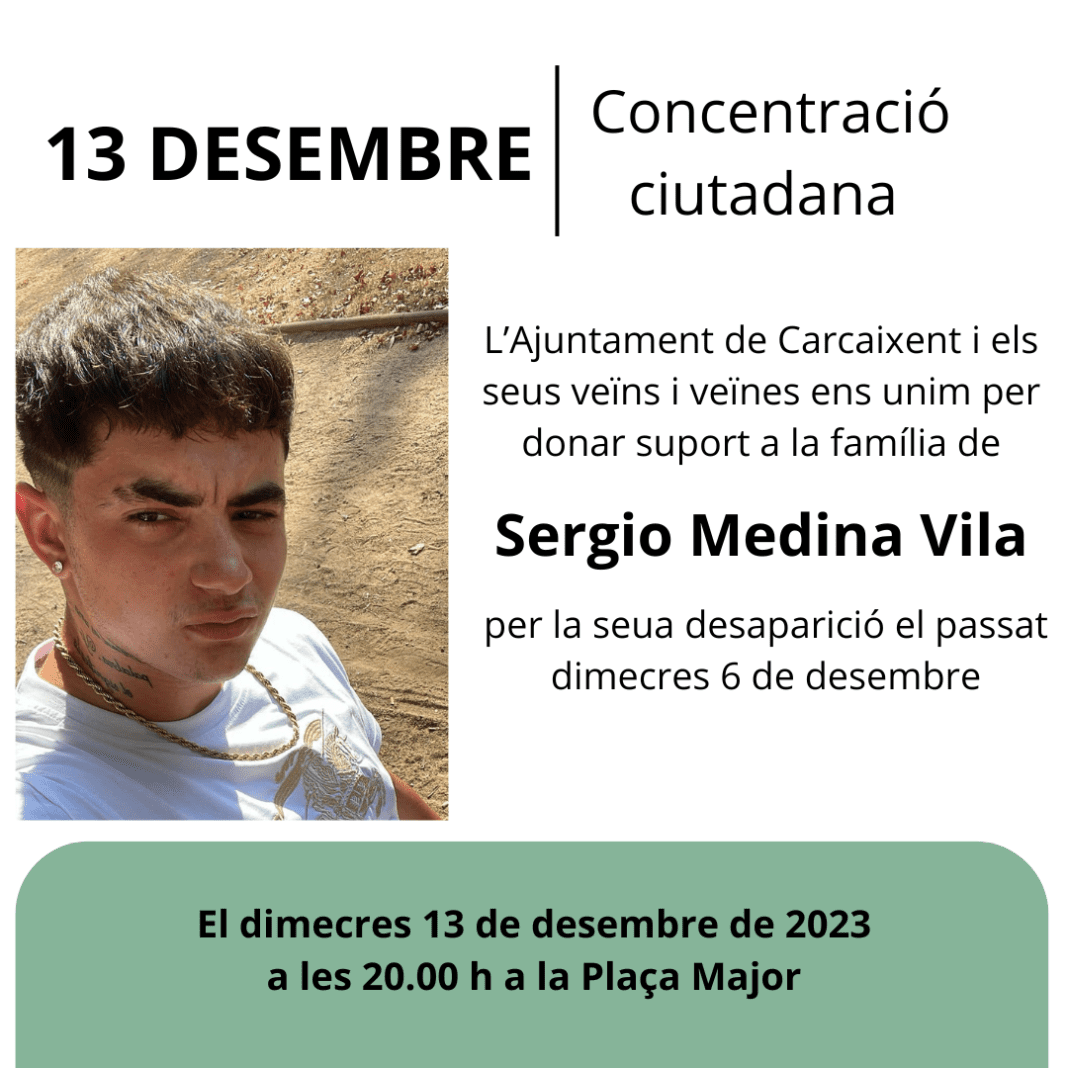 En un comunicado, el Ayuntamiento ha anunciado que la concentración ciudadana que se realizará mañana miércoles 13 de diciembre a las 20 horas en la Plaza Mayor y participarán los vecinos y vecinas de Carcaixent en apoyo a la familia de Sergio Medina Vila.