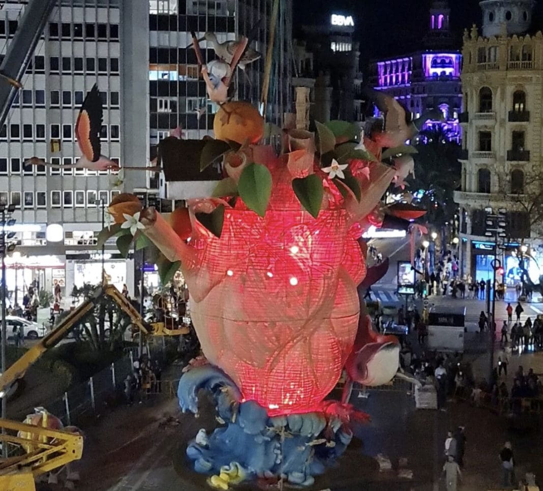 Los trabajos de montaje de la falla grande municipal bajo el título “Cardioversió valenciana”, un diseño de la artista plástica Marina Puche y del artista fallero Manolo García Lleonart, ya han empezado a dar forma a este monumento. Tras la semana de intenso trabajo, este viernes a última hora se ha coronado la parte central de la falla con la pieza superior del corazón de madera.