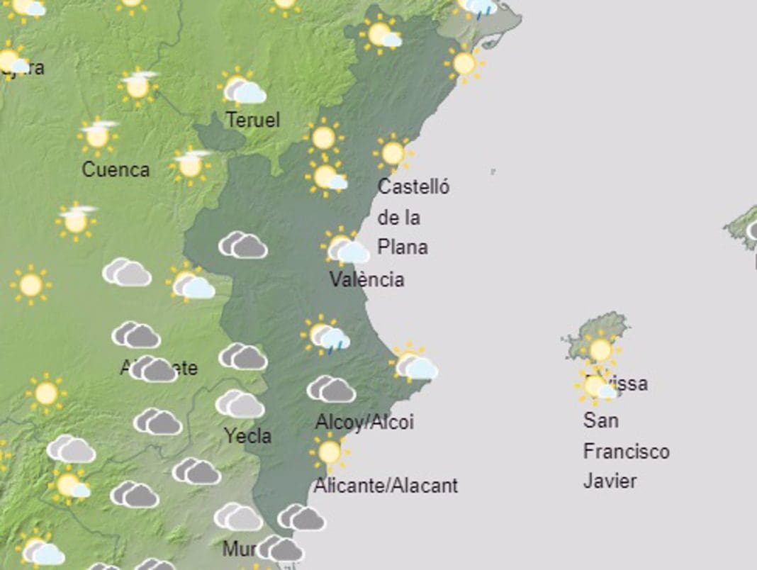 La Comunitat Valenciana vivirá un sábado marcado por los chubascos en el interior de la mitad norte, con las temperaturas máximas en ascenso, intervalos nubosos y probables calimas en zonas altas de la región, según la predicción de la Agencia Estatal de Meteorología (Aemet).