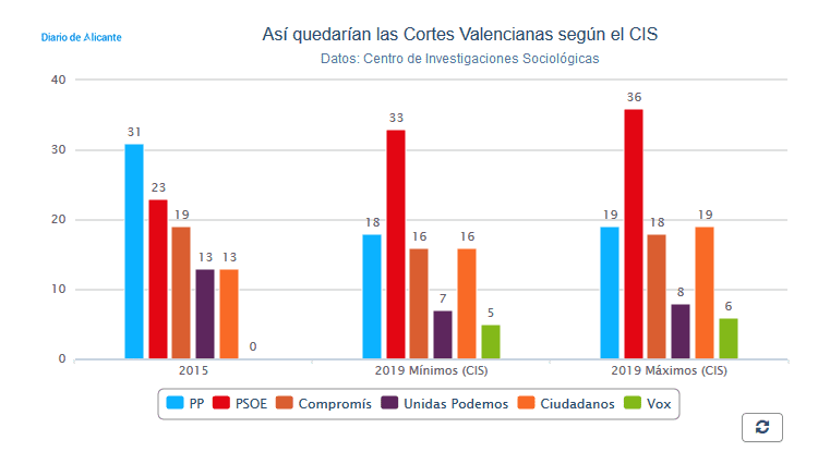 I a Alacant els socialistes valencians obtindrien entre 13 i 14 escons; el PP uns 6 escons; Compromís es quedaria amb 4; Ciudadanos podria aconseguir entre 6 i 7 escons; Unides Podem-EUPV sobre 3, i VOX es mouria entre 2 i 3 escons.