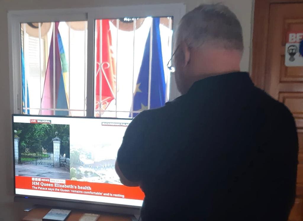 La comunidad británica de Alicante ha estado este jueves 8 de septiembre pendiente de las informaciones acerca del estado de salud de la reina Isabel II. Su corazón, en el Palacio de Balmoral donde ha fallecido la monarca. Las reacciones de los residentes a lo largo de la tarde han evidenciado su consternación por el previsible e inminente anuncio del Palacio de Buckingham sobre el deceso, del que ha informado la BBC a las 19:33 horas.