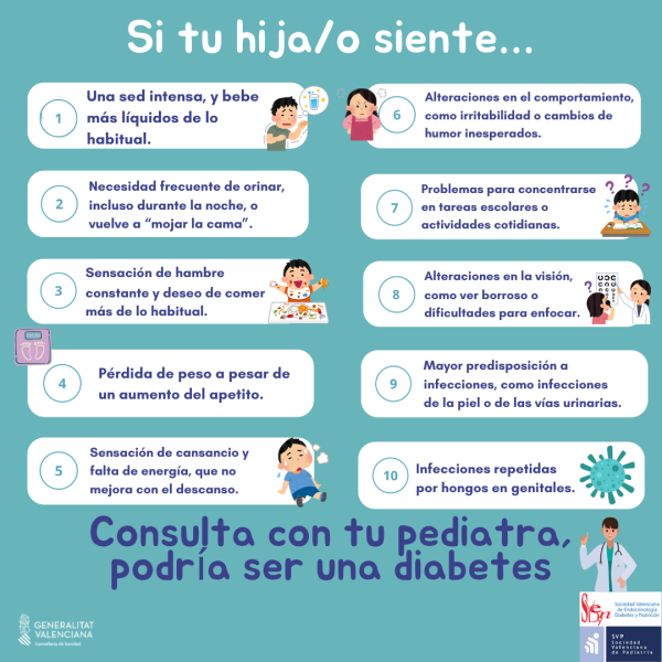 La directora general de Atención Primaria, Eva Suárez, destaca que “es importante que los padres y madres puedan detectar posibles síntomas asociados a la diabetes para que, en caso de sospecha, consulten cuanto antes a los pediatras”, lo que permite intervenir de forma más rápida. El decálogo incluye señales como sed excesiva, poliuria, hambre persistente, pérdida de peso, fatiga o alteraciones del comportamiento.
