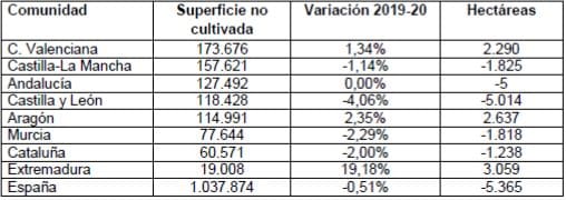 La valenciana sigue siendo la comunidad autónoma con mayor superficie abandonada de toda España, seguida por Castilla-La Mancha (157.621 Ha), Andalucía (127.492 Ha), Castilla y León (118.428 Ha) y Aragón (114.991 Ha).
