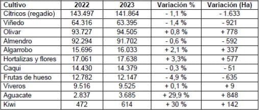 Los principales cultivos valencianos sufrieron importantes retrocesos en sus superficies. Los cítricos (naranjas, mandarinas y limones principalmente) perdieron 1.633 hectáreas, el viñedo 921 Ha, el almendro 592 Ha y las frutas de hueso (melocotones, nectarinas, albaricoques, ciruelos, nísperos y cerezas) descendieron 635 Ha.