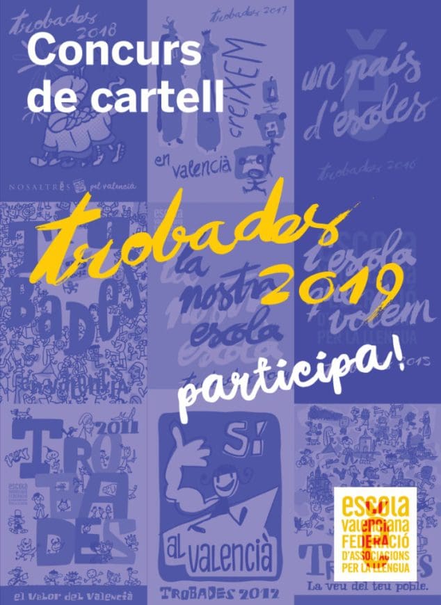 L’entitat cívica fomenta la creativitat i impulsa el nové art. Per primera vegada en 33 anys de Trobades d’Escoles en Valencià, la Federació d’Associacions per la Llengua – Escola Valenciana ha convocat un certamen per promoure la creació del cartell de les festes que expressen l’estima col·lectiva pel valencià. El concurs consisteix a representar gràficament (il·lustració i disseny) el lema de les Trobades 2019: “Som i serem paraules”, en homenatge a l’escriptor Francesc Ferrer Pastor. Les propostes es poden presentar individualment o en equip. Les obres s’enviaran per correu electrònic (trobades@escolavalenciana.org) i el termini de presentació està obert fins al 30 de juny.