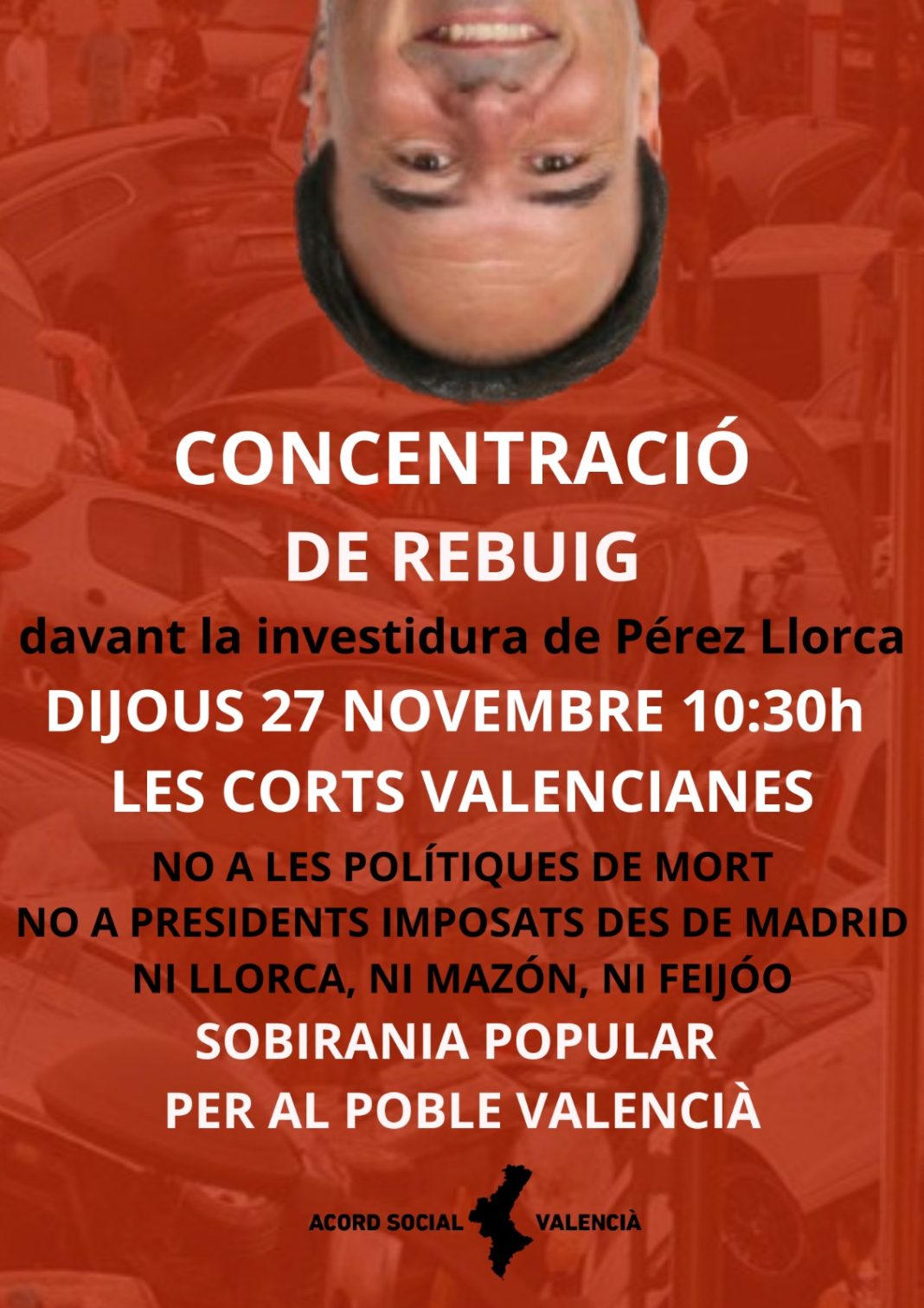 Acord Social Valencià ha convocado para el 27 de noviembre una protesta a las puertas de Les Corts para rechazar la investidura de Juanfran Pérez Llorca (PP) como president de la Generalitat. La concentración está prevista a las 10:30 y se desarrollará en paralelo al pleno de investidura que tendrá lugar en el interior del Parlamento.