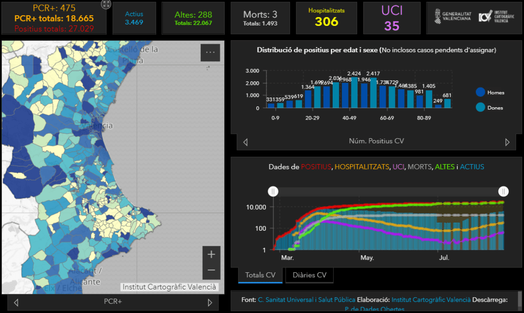 La Comunitat Valenciana ha registrat en la últimajornada 483 nous contagis de coronavirus confirmats per prova PCR, que situen la xifra total de positius en 19.605 persones. Per províncies la distribució és la següent: 42 a Castelló (2.257 en total); 143 a la província d’Alacant (6.208 en total); i 292 a la província de València (11.077 en total). A més, hi ha 6 casos sense assignar, amb el que l’acumulat de casos sense assignar ascendeix a 63.