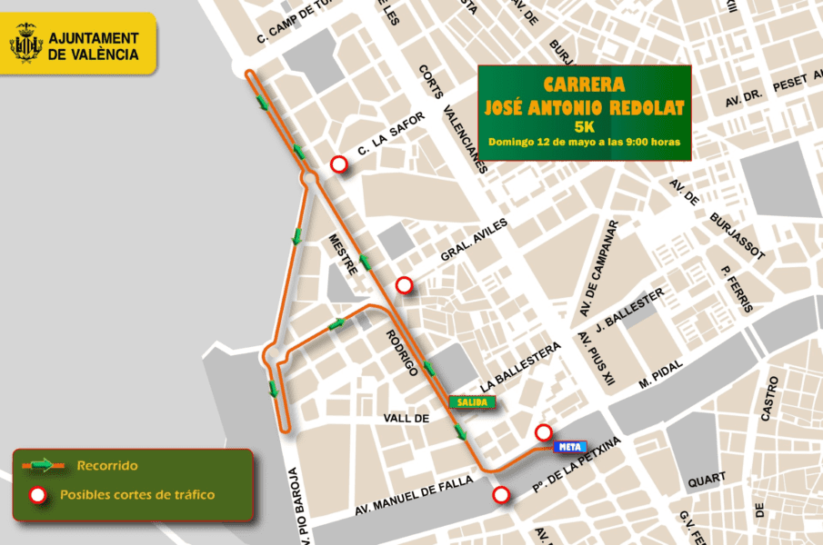 Debido al montaje de la salida de la carrera, el tramo de la avenida Maestro Rodrigo, entre Vall de la Ballestera y plaza de Badajoz, permanecerá cerrado a la circulación de 6 a 10 horas, aproximadamente.