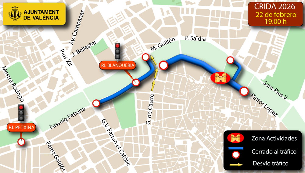 Por la tarde, desde las 17:00 horas, se cerrará al tráfico la marginal derecha del antiguo cauce del río Túria, incluidos los pasos inferiores, hasta la finalización del pregón.