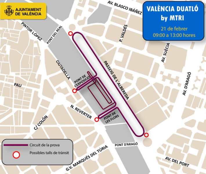 La competición se desarrollará entre las 09:00 y las 13:30 horas, y afectará al tramo del paseo de l’Albereda comprendido entre el puente del Real y el puente d’Aragó, así como a los puentes de les Flors y de l’Exposició, además del interior del antiguo cauce del río Túria.