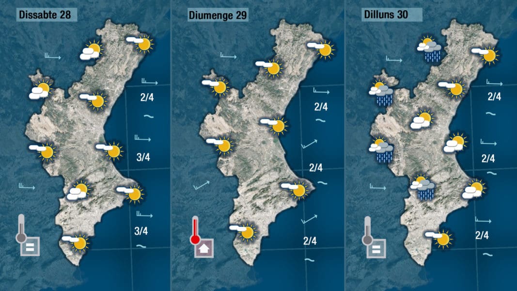 Cómo veis al mapa el poniente nos acompañará también el fin de semana y el inicio de la que viene. Sábado y domingo con menos nubes y temperaturas más altas y lunes con más nubes y chubascos débiles por el interior.