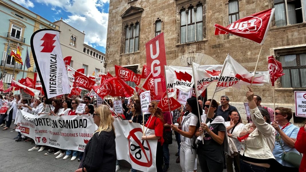 Personal de la sanidad valenciana, convocado por la Federación de Sanidad y Sectores Sociosanitarios de CCOO PV, la Federació de Serveis Públics de UGT-PV e Intersindical Salut, se ha concentrado este martes ante el Palau de la Generalitat para volver a mostrar su rechazo a las últimas medidas adoptadas por la Conselleria de Sanidad, que «suponen retrocesos en sus condiciones laborales y en la calidad asistencial».