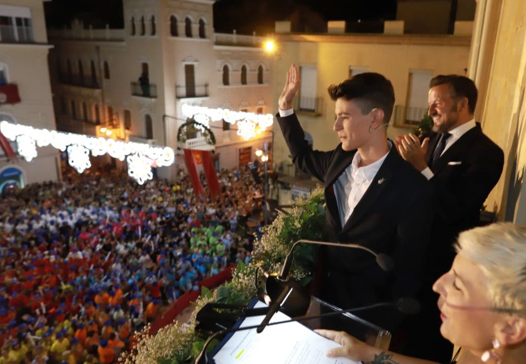 El alcalde, Pablo Ruz, ha acompañado a David Agulló hasta el balcón del Ayuntamiento, donde arropado por la edil de Festejos, Inma Mora, los portavoces de los grupos políticos, miembros del gobierno municipal y la corporación, además de representantes de los entes festeros de la ciudad y las reinas y damas de las fiestas ha arrancado su pregón entre vítores y aplausos, dedicando el pregón a una persona muy especial “que como otros años me estaría apoyando y viendo desde su casa, mi yaya Margarita, y que hoy me estará viendo desde el cielo”.