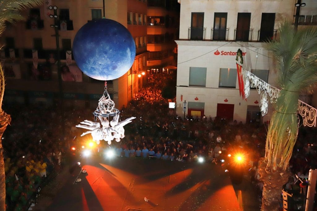 Antes de finalizar el acto, ha sonado el Himno de Elche, de la Comunidad Valenciana y de España, para después concluir con una actuación en el centro de la plaza de Baix, una fusión de ballet aéreo con acrobacias donde se elevan a una altura de 35 metros.