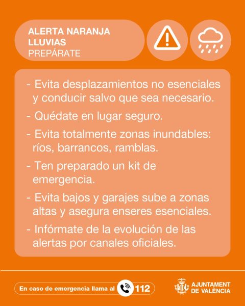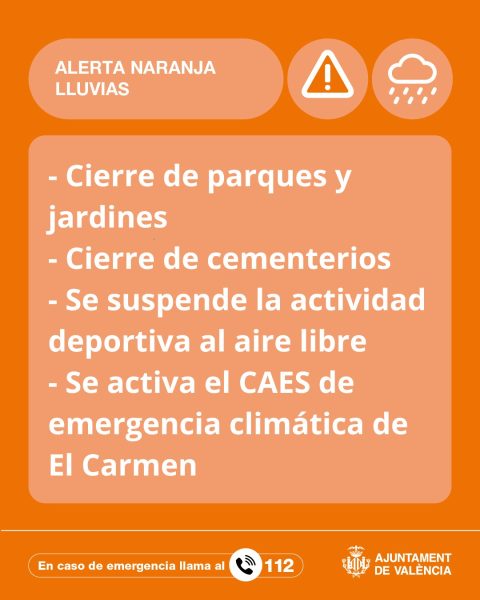 En la ciudad de València, el Ayuntamiento ha decretado el cierre de parques y jardines, así como de los cementerios, y ha suspendido la actividad deportiva al aire libre. Asimismo, se ha activado el CAES de emergencia climática de El Carmen. En caso de emergencia, las autoridades recuerdan que se debe llamar al 112.
