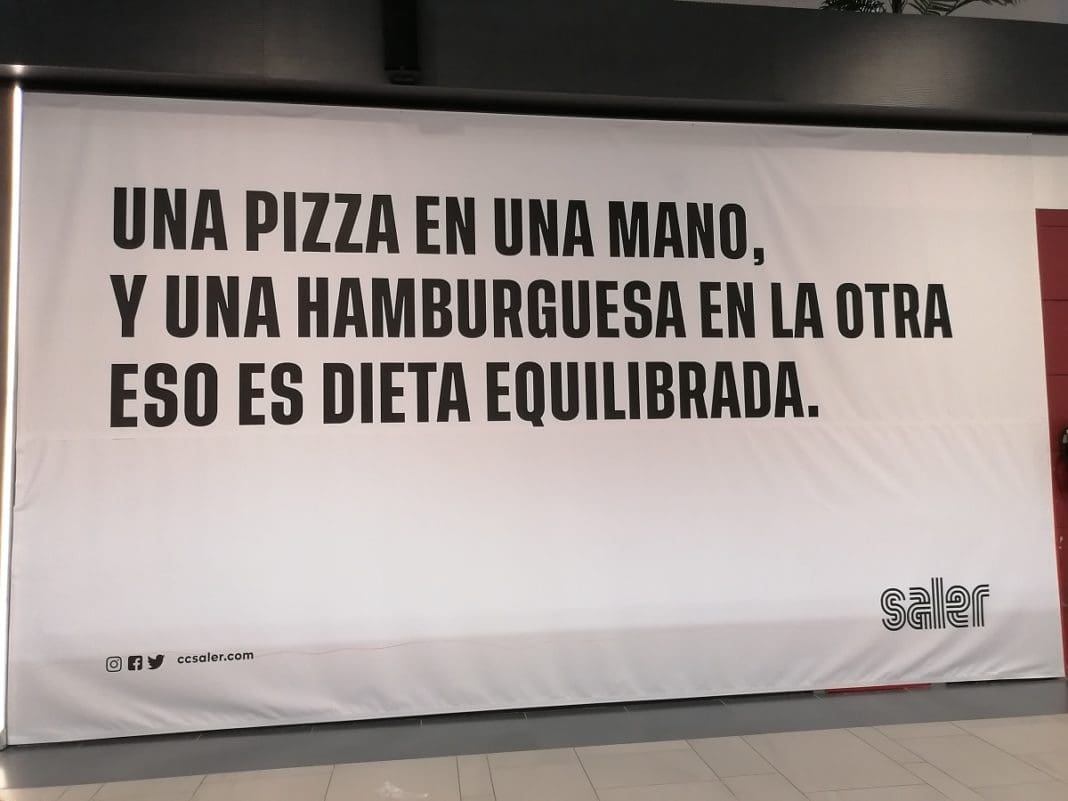 «Hemos solicitado la retirada de la publicidad del Centro Comercial El Saler cuyo contenido indica lo siguiente: “una pizza en una mano y una hamburguesa en la otra. Eso es dieta equilibrada”, y que se engloba en la campaña de nueva imagen de estas instalaciones, un juego de palabras y un recurso publicitario que normaliza e incluso recomienda el consumo de estos alimentos como parte de una “dieta equilibrada”, explican en el comunicado.