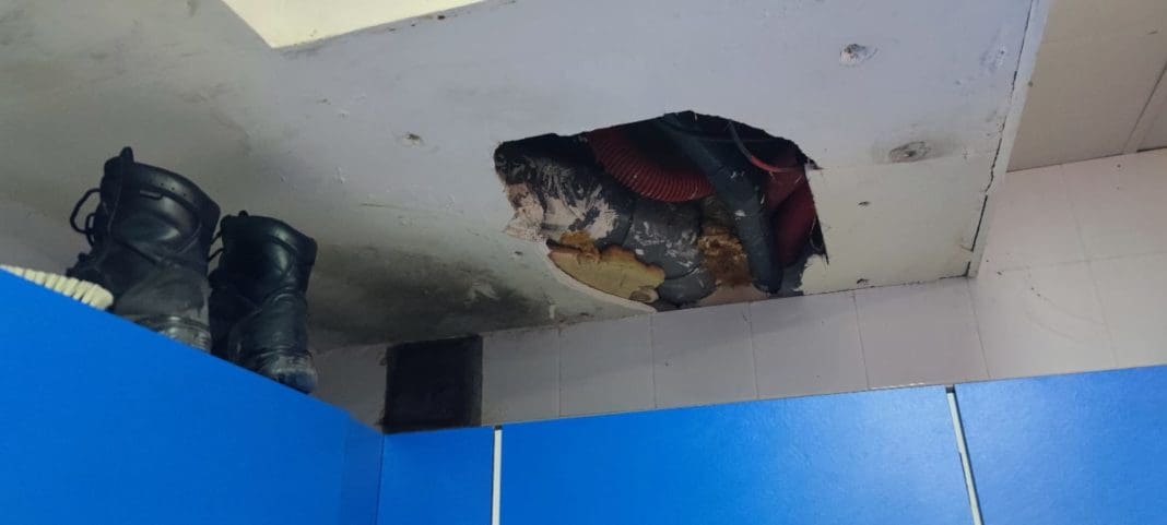 La Central Sindical Independiente y de Funcionarios (CSIF), en el informe que ha elaborado, avisa, por ejemplo, del “agujero en el techo del interior del vestuario masculino”. “Se encuentra encima de taquillas de ropa, a las cuales les cae el agua cuando se producen fuertes lluvias”, continúa indicando.