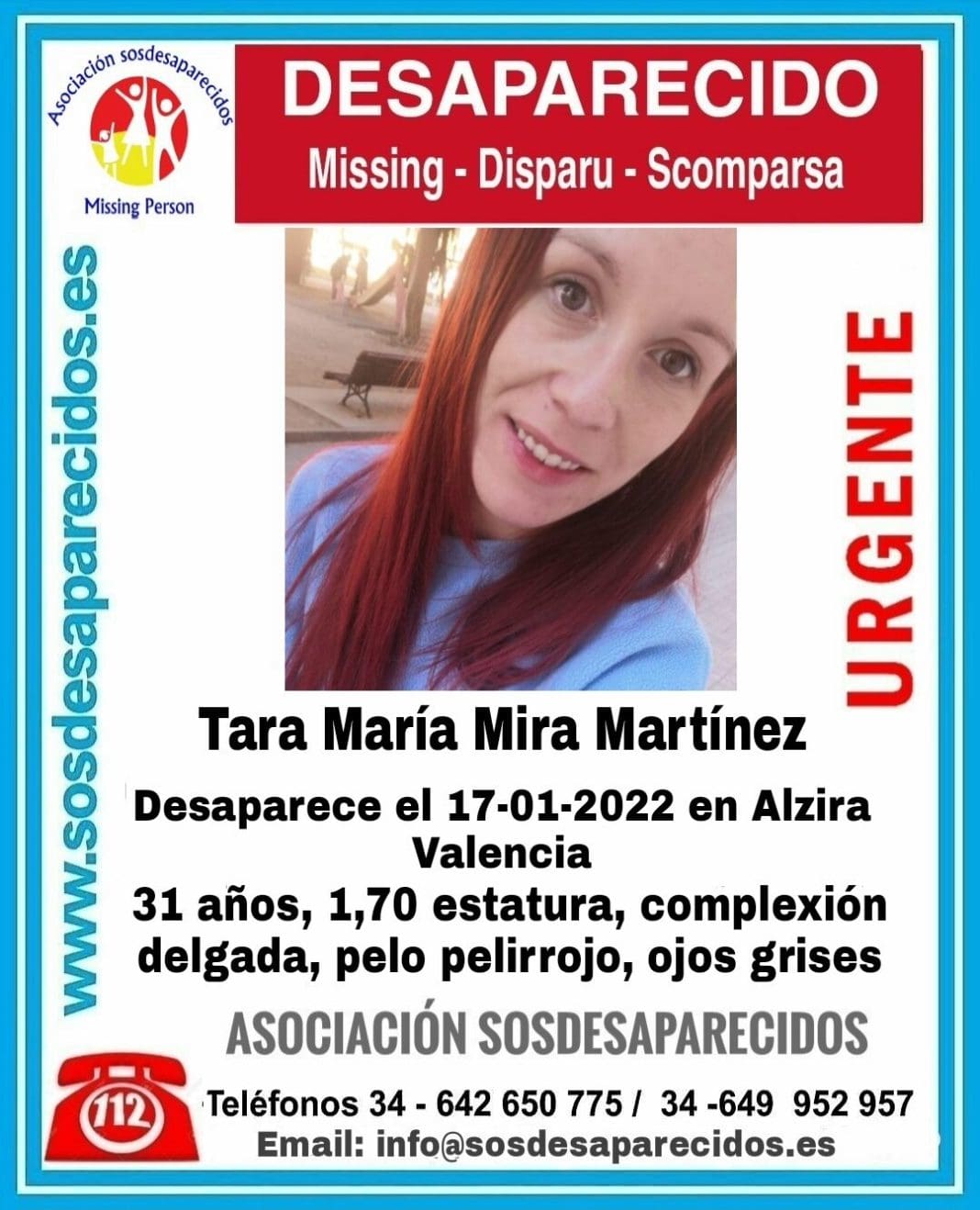 El centro nacional de desaparecidos ha activado una alerta denunciando la desaparición de Tara María Mira de 31 años 1,70 metros, de complexión delgada, pelirroja y ojos grises.