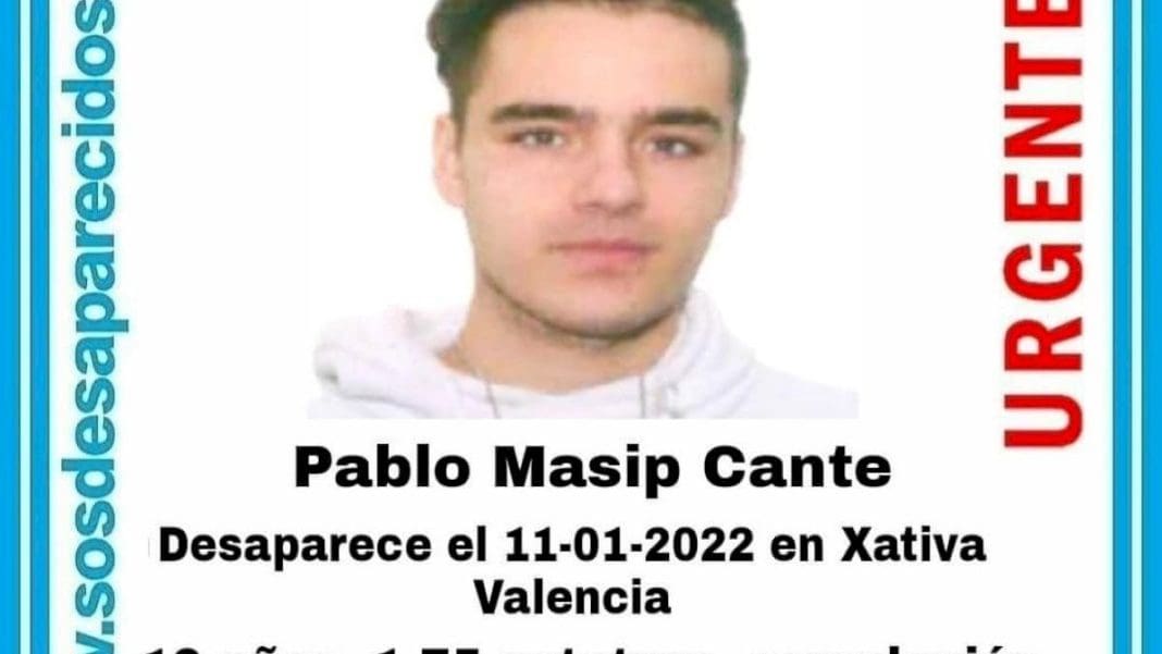 El joven, llamado Pablo Masip Canet, desapareció el pasado martes 11 de enero. Mide 1,75 metros de altura y pesa unos 75 kilos. El día de su desaparición vestía una chaqueta negra con cremallera dorada, una sudadera verde con capucha, pantalón chándal gris claro y zapatillas deportivas blancas.
