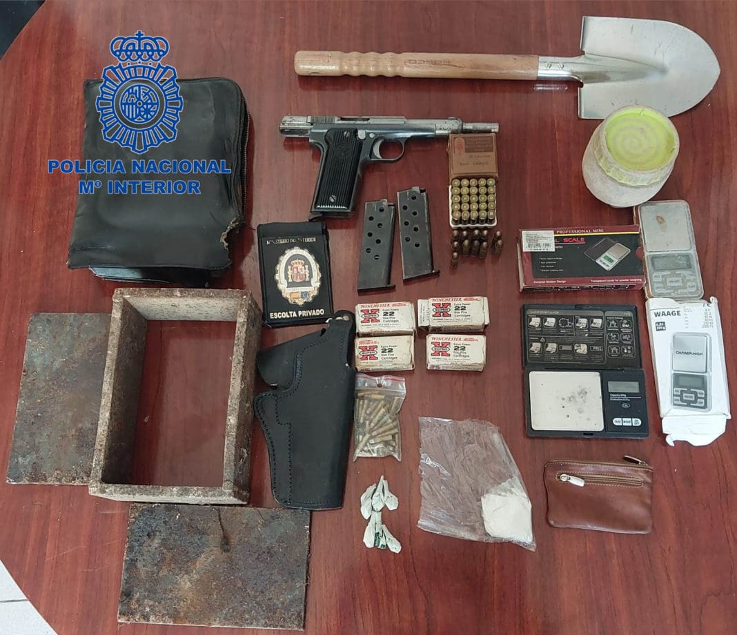 Finalmente, tras varias indagaciones, registraron el domicilio, localizando e interviniendo; una pistola semiautomática calibre 9 mm largo, 35 cartuchos del calibre 9 mm largo, 100 cartuchos del calibre 22, 4 gramos de cocaína, 4 gramos de marihuana, 11 gramos de sustancia de corte, 225 euros en efectivo, cinco balanzas de precisión, una prensa para compactar cocaína, una pala, una placa de escolta privado y una funda de pistola.