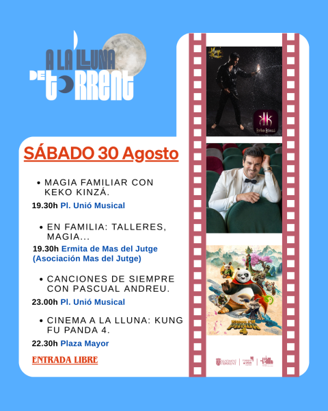 La alcaldesa de Torrent, Amparo Folgado, ha señalado: “Con este último fin de semana cerramos un mes en el que el Ayuntamiento ha vuelto a apostar por acercar la cultura a barrios y urbanizaciones, demostrando que en agosto la cultura no se detiene. Invitamos a todos los vecinos, veraneantes y visitantes a disfrutar de un cierre único con circo, magia, música y cine gratuito en nuestras plazas y calles”.