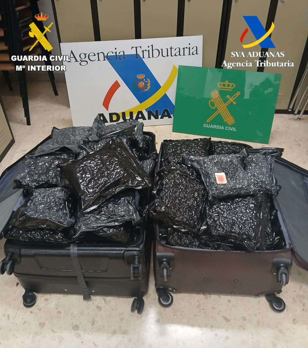 La Guardia Civil y la Agencia Tributaria en tareas propias de resguardo fiscal y aduanero, bajo jurisdicción aduanera, han detenido en el aeropuerto de Manises a dos pasajeros de un vuelo procedente del Sudeste asiático, vía aeropuerto de Madrid, tras encontrar más de 45 kilogramos de marihuana en su equipaje a su llegada al aeropuerto de Valencia.