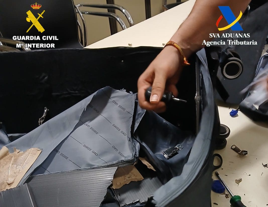 Guardia Civil de Valencia y Vigilancia Aduanera de la Agencia Tributaria, en tareas propias de resguardo fiscal y aduanero, bajo jurisdicción aduanera, han detenido a una mujer que trataba de introducir 6,3 kilogramos de cocaína en Valencia a través de un vuelo internacional. La droga se encontraba impregnada en la propia estructura de la maleta y sus superficies interiores.
